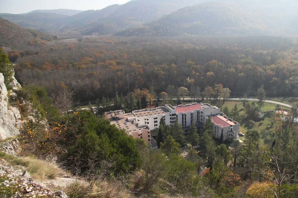 Na vrhu je puhala jaka bura zbog koje smo, brže nego smo mislili, krenuli natrag. Iznad toplica su i okna rudnika u stijenama koja se s vrha stijene dobro vide i koja će biti jedna od naših narednih destinacija. Spuštanje sa stijene bilo je istim putem. Na nekim mjestima osjeti se jak miris sumpora koji smo još jače osjetili u šetnji cestom od toplica prema Motovunu.